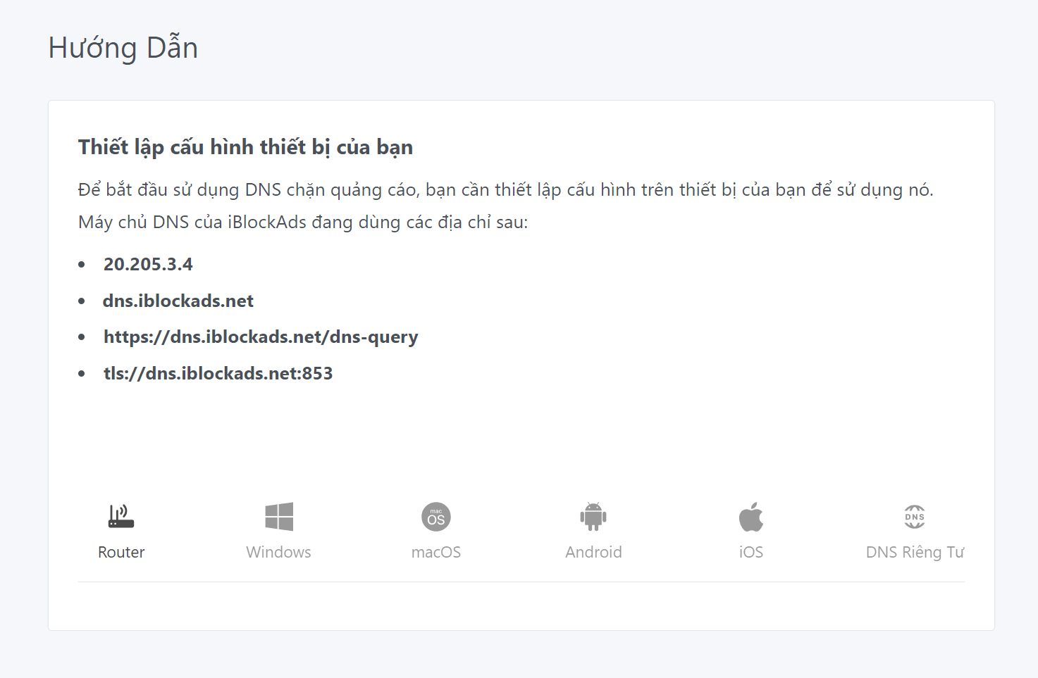 Để bắt đầu sử dụng những bộ lọc quảng cáo của chúng tôi, bạn chỉ cần thiết lập máy chủ DNS trên thiết bị của bạn.